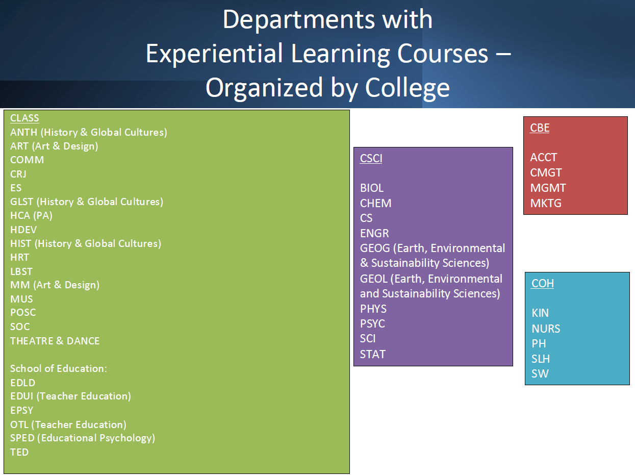 There are a variety of courses at the university which connect students with applied, real-world learning experiences. In addition to terms such as community engagement, service learning, and internship, these courses may use such descriptive words as: applied, capstone, clinical, fieldwork, practicum, student teaching. In general, this means that students are engaged in experiential learning activities as part of course learning. Many of these courses fall under the umbrella of "CESLI" courses (community engagement, service learning, internships).