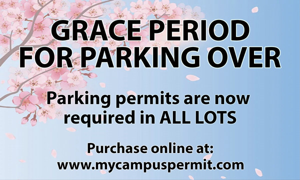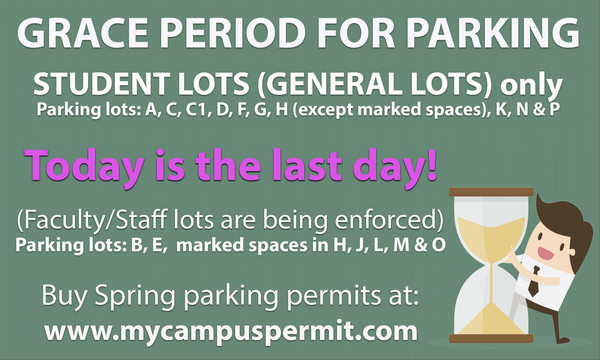 The last day of the grace period is Monday, January 26th. We will begin enforcing in Student Lots (General Lots) again on Tuesday, January 27th. Make sure to order your semester permit early at www.mycampuspermit.com . Or purchase a daily/hourly permit at one of our dispensers on campus (map).