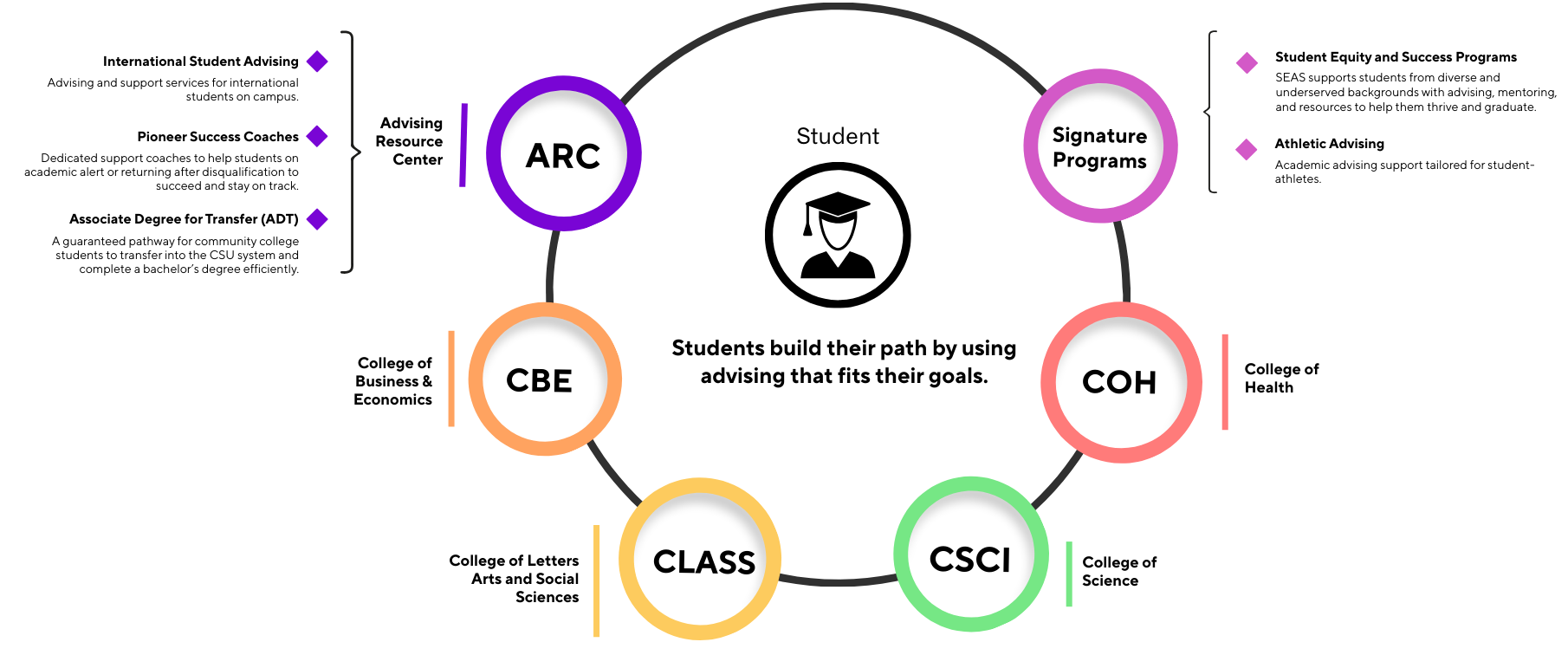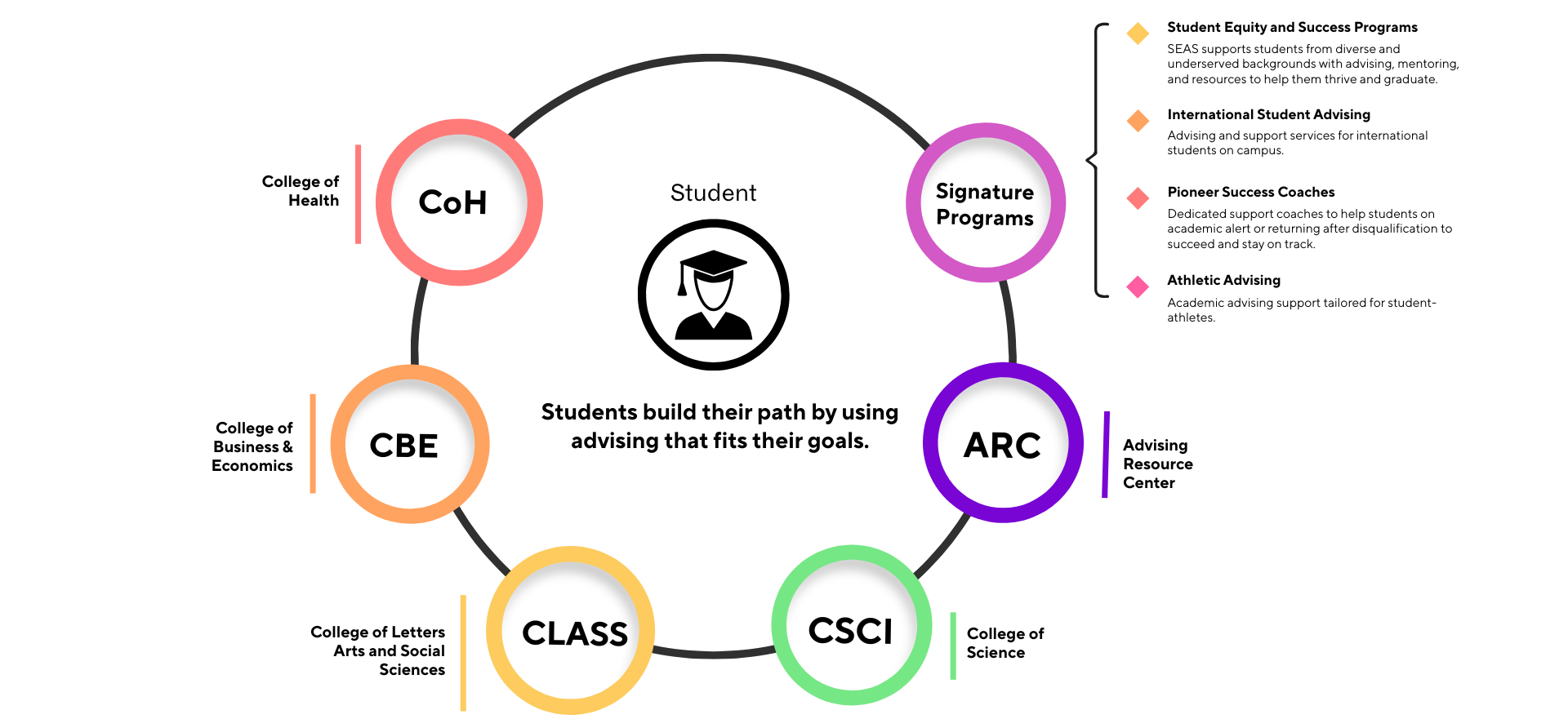 Students will be provided with consistent, robust, and holistic advising supported by a team of advisors housed within College Centers and Signature Programs. Advising will be aligned with students’ major and career goals, supportive of student identities, and focused on improving retention and graduation rates through strong relationships and inclusive communities.