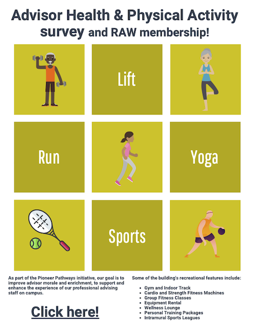 - Advisor Health and Wellness - This initiative invites internal advising staff to participate in gym memberships on campus, group activities in community, and ways to connect and energize after much time apart.