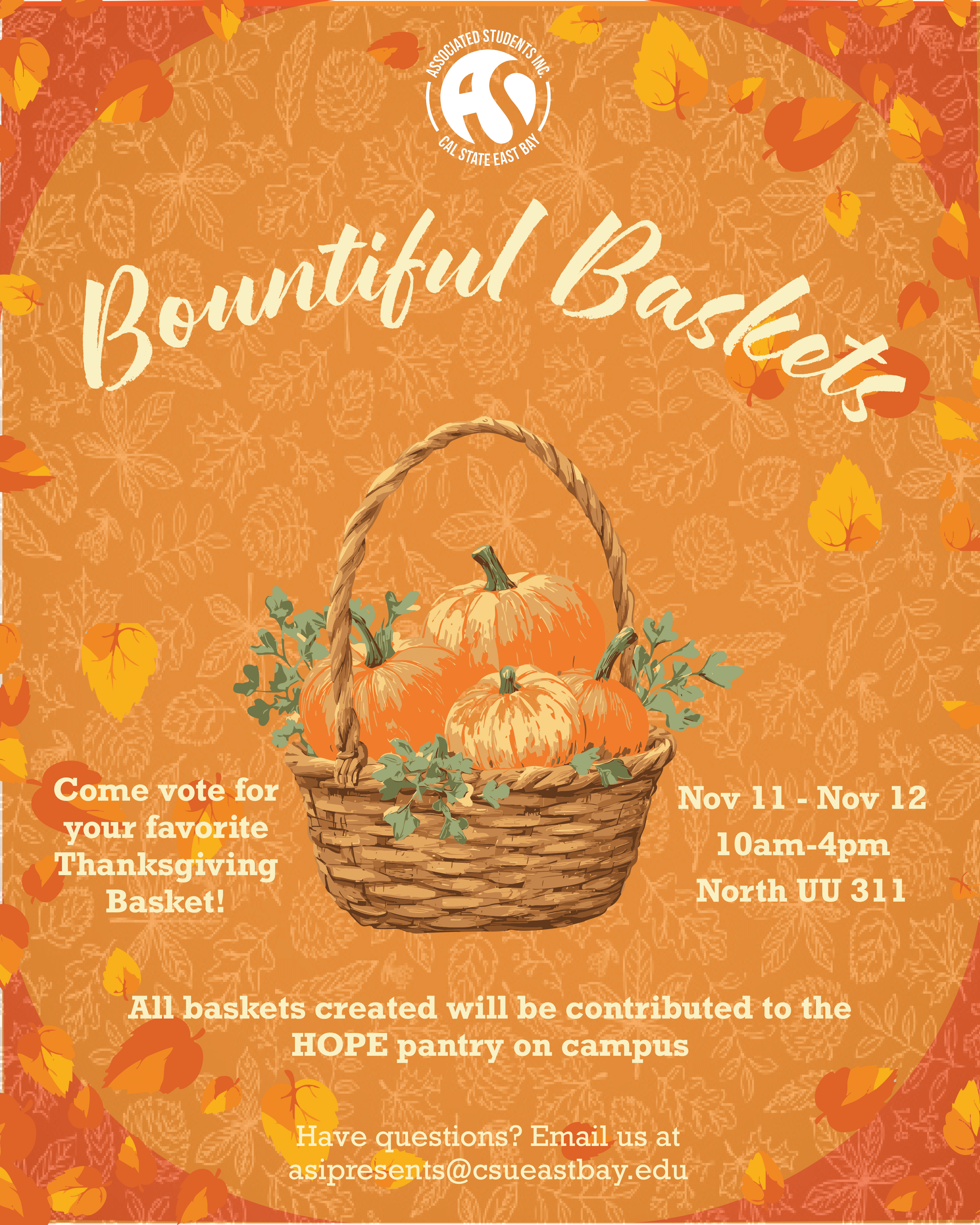 Description: Get ready to trick or treat! Campus departments will sign up to hand out candy; Students will stop by the ASI office and get a special treat bag and a map of locations. Departments can also decorate for a chance to win a 1st place trophy!