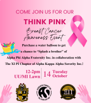 Description: Purchase a water balloon to get a chance to "Splash a brother" of Alpha Phi Alpha Fraternity Inc. in collaboration with Alpha Kappa Alpha Sorority Inc.! All proceeds will be donated to "Keep A Breast Foundation" and "African American Cancer Alliance".