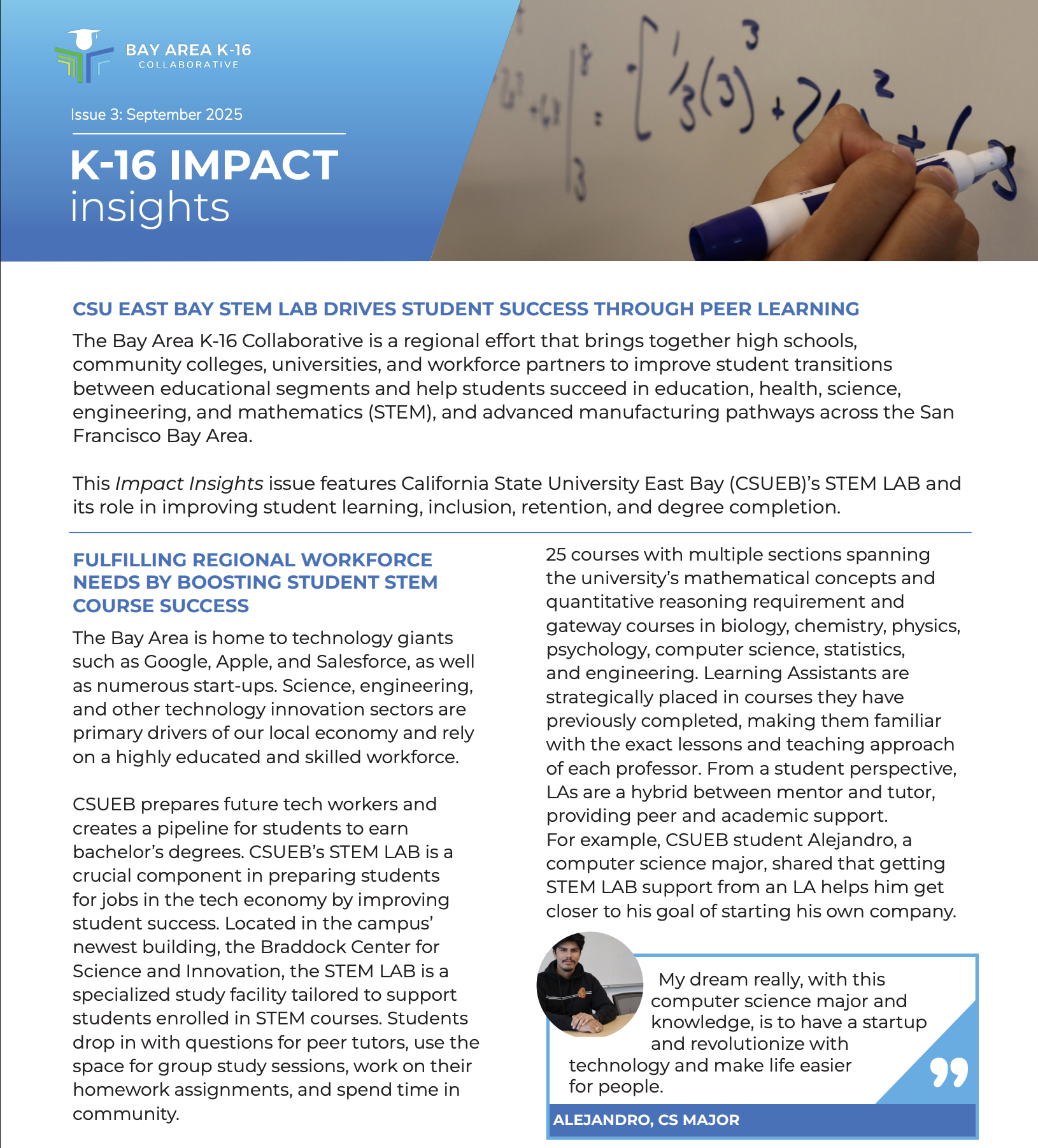 The Bay Area K16 Collaborative, which provided funding for the STEM LAB last year and this year, recently highlighted CSU East Bay’s STEM LAB and Learning Assistant Program, showcasing how these initiatives build community in the classroom and support student success. By fostering hands-on learning and peer mentorship, these efforts strengthen engagement and increase student retention.