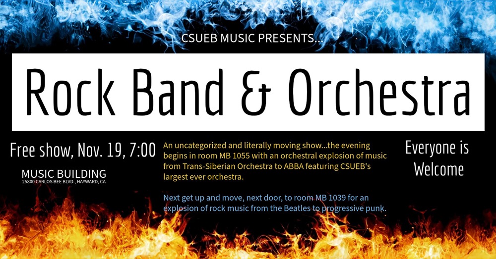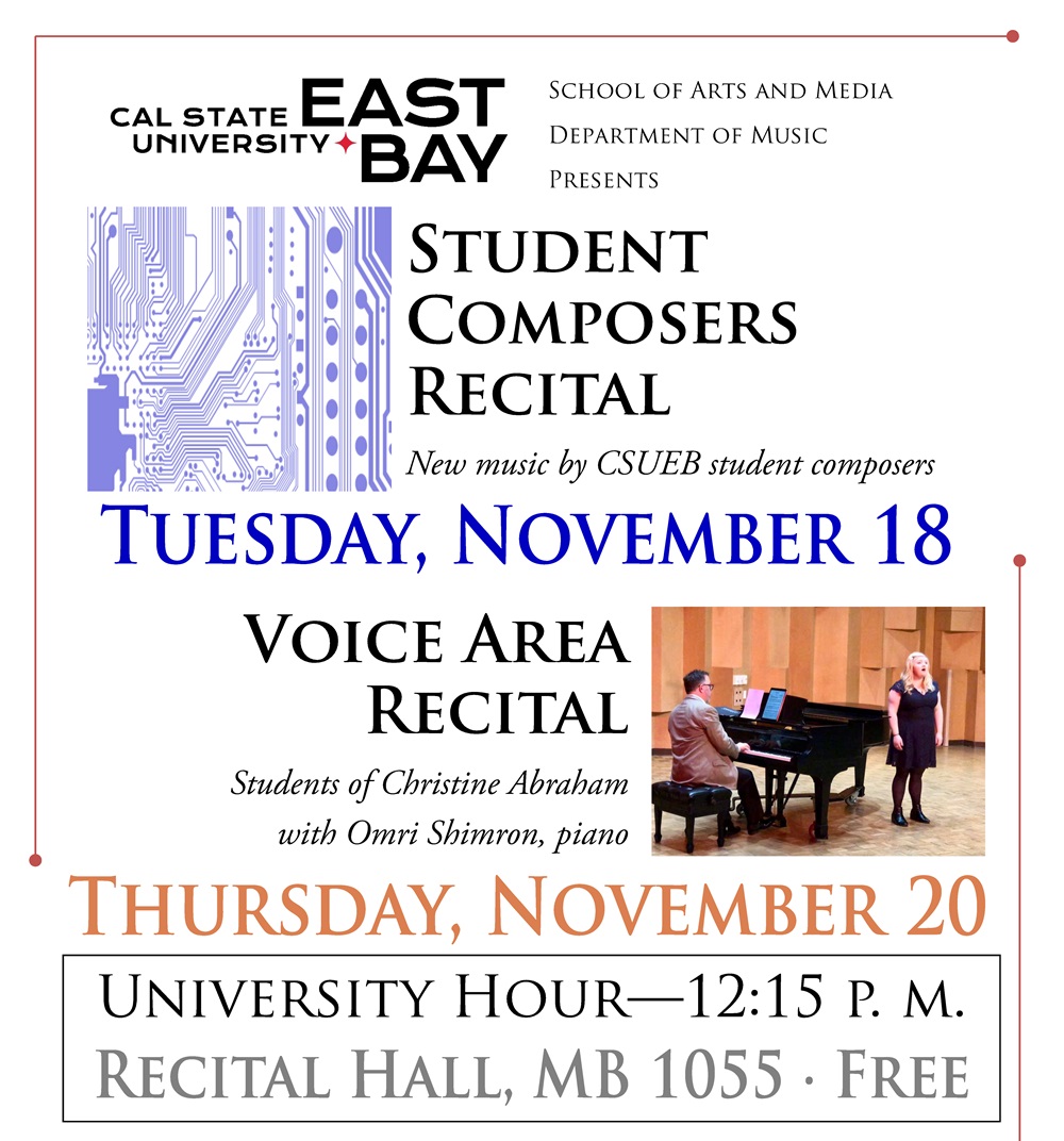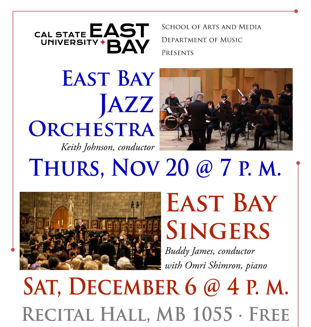 All events held in the Recital Hall are free and open to the public. Events held in the University Theater will require a ticket for attendees without a CSUEB ID: $15 General and $10 Seniors (55+), Youth (age 3-18), Military (active or retired) and Non-CSUEB Educators and Non-CSUEB Students.