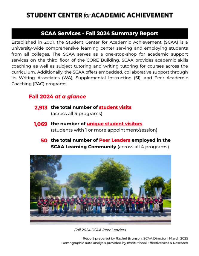 • SCAA Mission Statement: The mission of the Student Center for Academic Achievement (SCAA) is to provide CSUEB students with individual and collaborative learning opportunities within an inclusive environment fostering independent growth. The SCAA strives to cultivate adaptability, self-direction, and self-confidence through peer-to-peer support programs. SCAA services help students set achievable goals, develop academic skills, and improve subject comprehension.