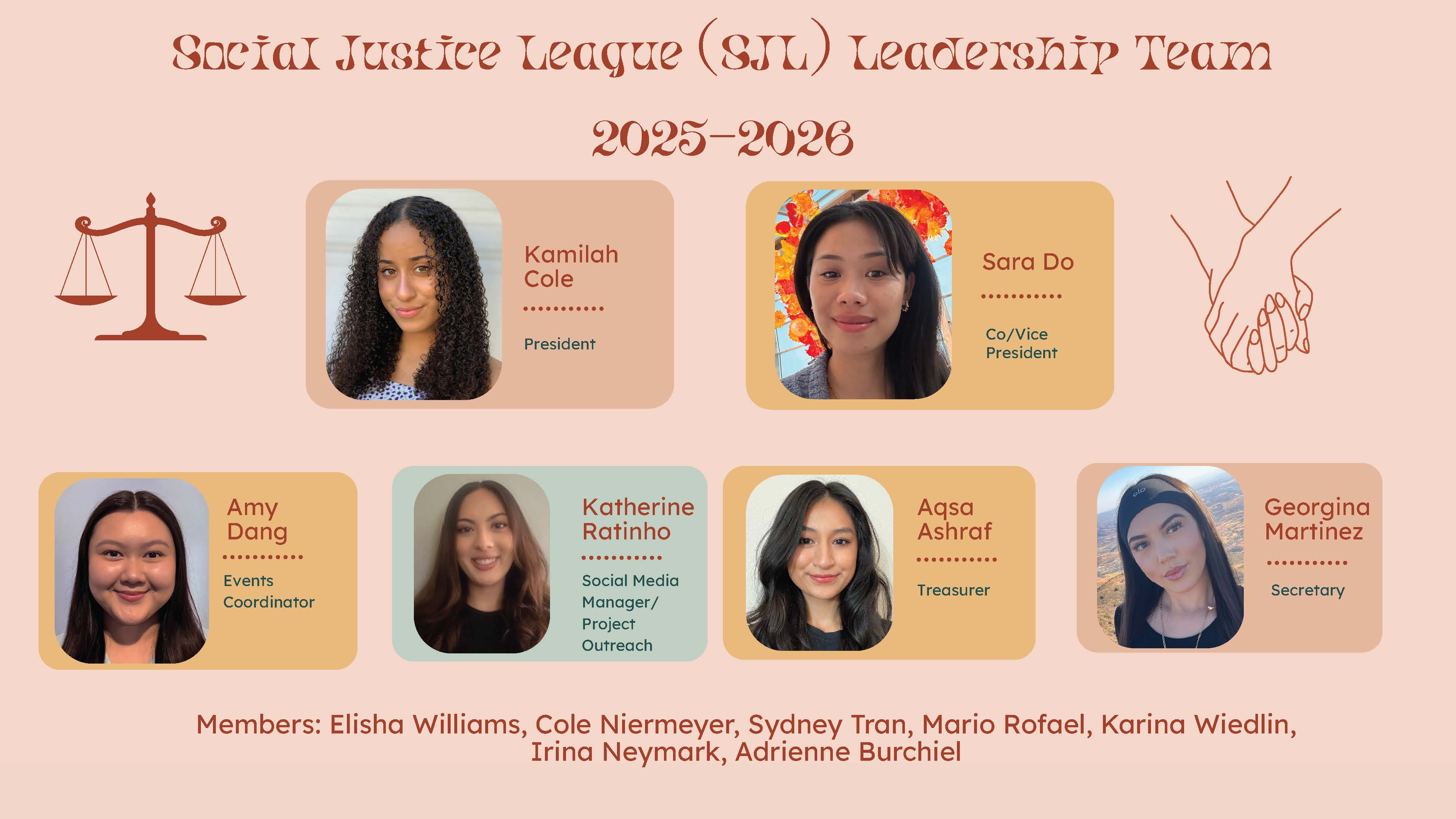 The Social Justice League (SJL) is a student organization that is supported by the Department of Educational Psychology and recognized by CSUEB. SJL was created in 2011 by students in the School Psychology and School Counseling Programs. The SJL's mission is to promote and advocate for diversity and equality for underserved populations. We are committed to fighting social injustices, promoting awareness about social issues, and providing resources and support to underprivileged communities. Each semester, SJL participates in and sponsors various activities, on and off campus, to support the community (e.g., fundraising, school adoptions, mental health awareness) as a way to give back, empower, and educate those without voices.