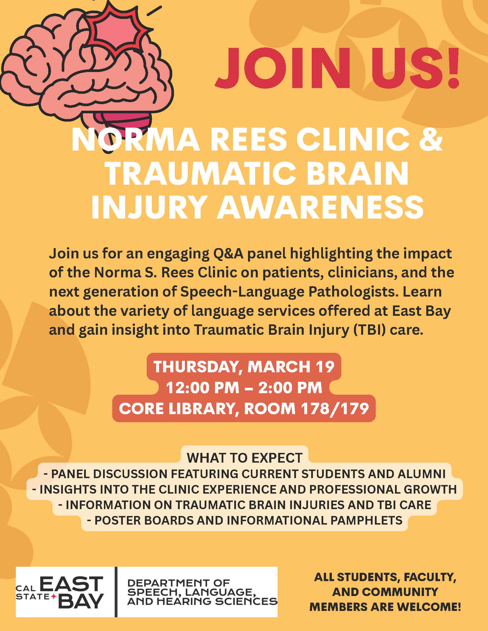 Join us to learn about the Norma S Rees Clinic's impact on current, former, and future Speech Language Pathologists and the variety of language services offered at East Bay! Come to listen to this Q&A about the clinic experience, its impact, learn about Traumatic Brain Injuries and TBI care from our panel of current and former CSUEB SLHS students/alumni/associates!
