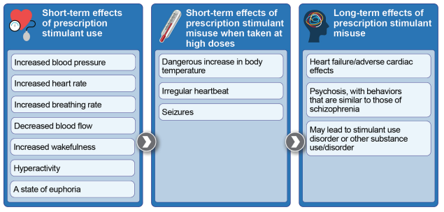 Individuals who misuse prescription stimulants may also experience other short- and long-term health effects. Using prescription stimulants non-orally and/or in combination with other substances, as is typically done for recreational purposes, is more likely to cause adverse health effects than when taken orally. Non-oral use also increases the risk of developing a stimulant use disorder.